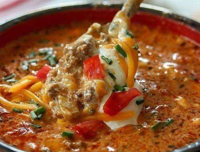 Saute ground beef, onion and bell pepper over medium heat until meat is no longer pink. Add garlic cloves, beef broth, tomatoes, salsa and taco seasoning. Bring to boil and then lower to a simmer for 15 minutes. Then slowly add softened cream cheese, heavy cream and cheddar cheese to the pot. StirServe and garnish with your favorite taco toppings.