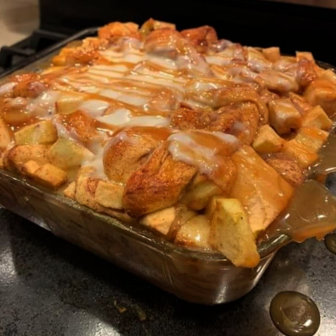 Spread 1/2 apple out of the filling and drizzle 2-3 tablespoons of caramel sauce on top. Cover with another layer of cinnamon rolls.