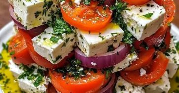 A stunning Mediterranean-inspired salad featuring layers of creamy feta cheese, juicy tomatoes, crisp red onions, and fresh herbs, all drizzled…