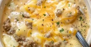 Ingredients: 1 lb ground beef1 small onion, diced3 cloves garlic, minced4 cups potatoes, diced4 cups beef broth1 cup whole milk2…