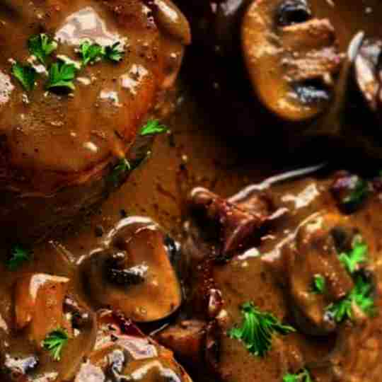 - Serve the pork chops smothered in the rich mushroom gravy, garnished with fresh parsley.