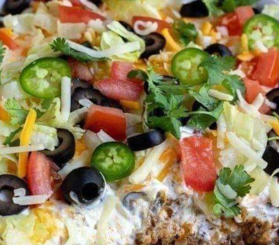 Preheat the Oven: Set your oven to 350°F (175°C) and grease a large baking dish.Cook the Beef: In a large skillet over medium heat, cook the ground beef until browned and fully cooked. Drain any excess fat. Add the taco seasoning and water to the beef, stir, and let it simmer for about 5 minutes until the seasoning is well absorbed.Prepare the Layers:Spread the refried beans evenly across the bottom of the greased baking dish.Top the beans with the seasoned beef mixture.In a small bowl, combine the sour cream and cream cheese until smooth. Spread this mixture over the beef layer.Cheese Layer: Sprinkle the shredded cheddar and Monterey Jack cheeses over the creamy layer.Bake: Place the casserole in the oven and bake for about 15-20 minutes, or until the cheese is melted and bubbly.Add Fresh Toppings: Once out of the oven, top the casserole with shredded lettuce, diced tomatoes, black olives, jalapeños, and cilantro.Serve: Let the casserole cool slightly, then serve with tortilla chips for scooping.Enjoy.