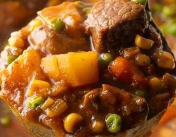 • Instructions:Instructions:In a large pot, brown the stewing beef over medium heat. Add diced onions and minced garlic, cooking until the onions are softened.Add sliced carrots, diced potatoes, chopped green beans, diced tomatoes, and beef broth to the pot. Stir in dried thyme, dried rosemary, salt, and pepper. Bring the stew to a simmer.Let the stew simmer for about 30-40 minutes or until the meat is tender and the vegetables are cooked through.Add corn kernels, peas, and shredded cabbage to the pot. Cook for an additional 10-15 minutes.Adjust the seasoning to taste and serve the stew hot, garnished with fresh parsley.Nutritional Information (Approximate Values Per Serving – Recipe Makes about 6 Servings):Calories: Around 300-350 kcalTotal Fat: 10-12gSaturated Fat: 4gMonounsaturated Fat: 4gPolyunsaturated Fat: 1gSodium: 800-1000mgTotal Carbohydrates: 30-35gDietary Fiber: 6-8gSugars: 6-8gProtein: 25-30g